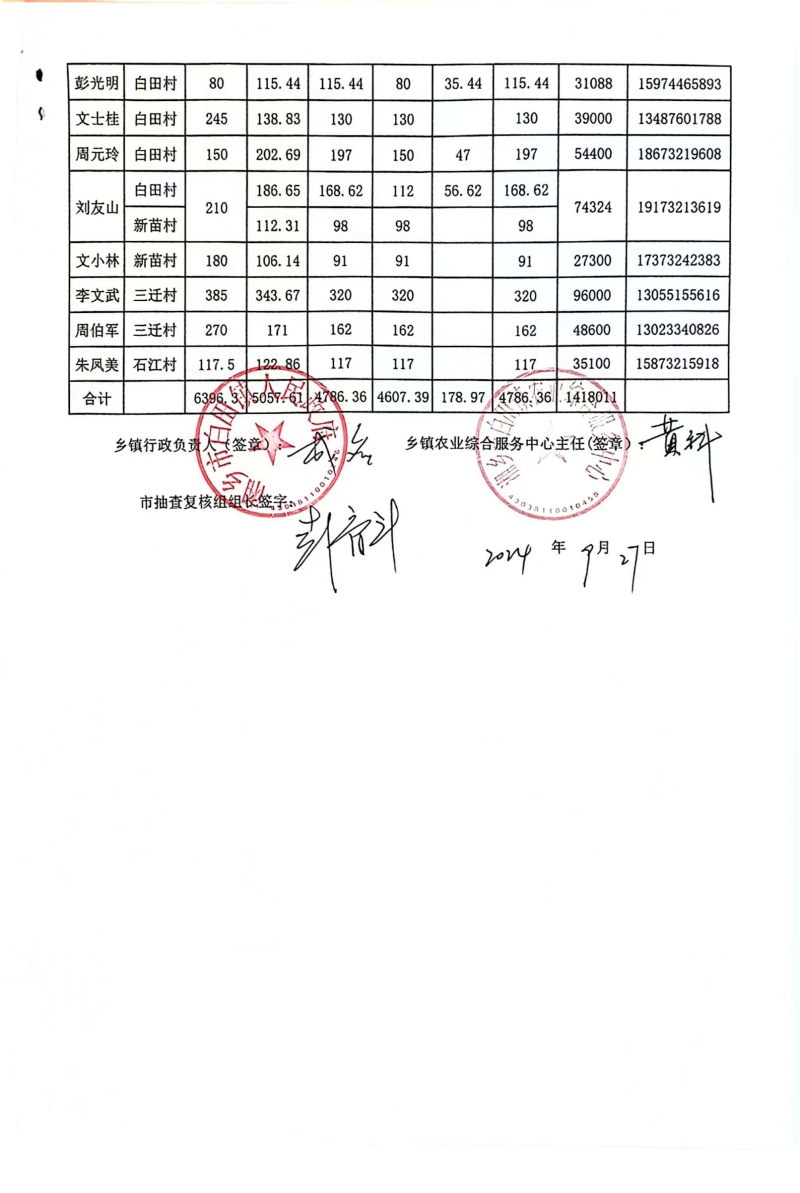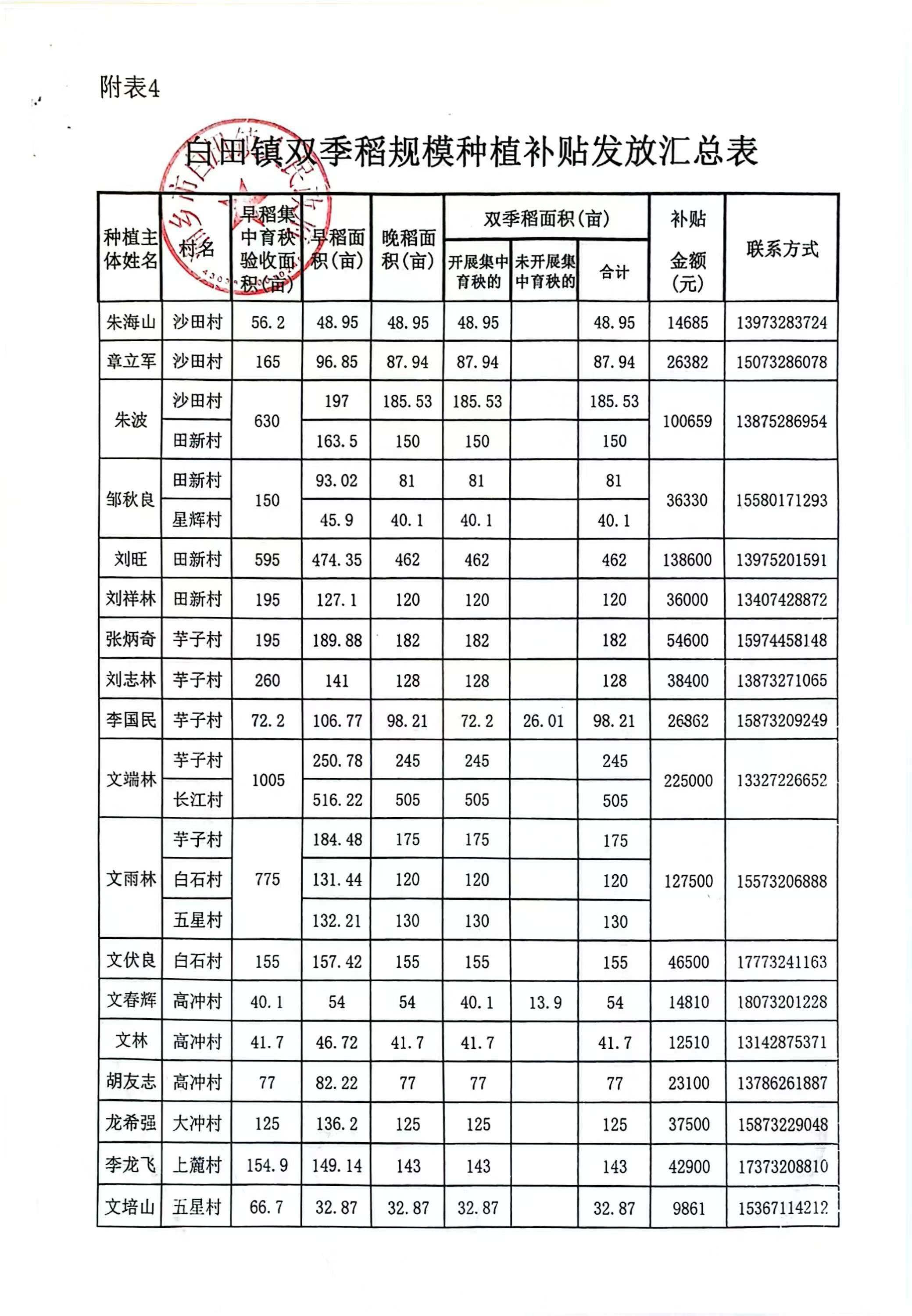 白田鎮雙季稻規模種植補貼發放匯總表
