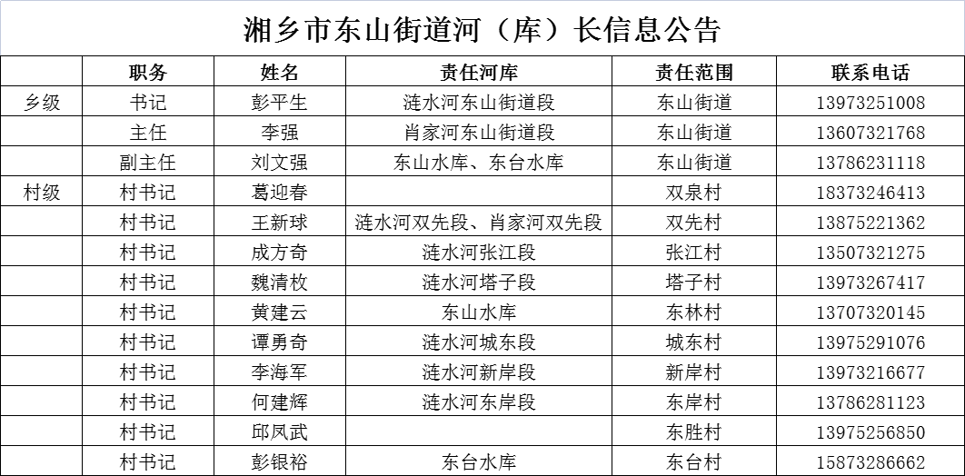 湘鄉市東山街道河長制工作委員會辦公室(河(庫)長信息公告)
