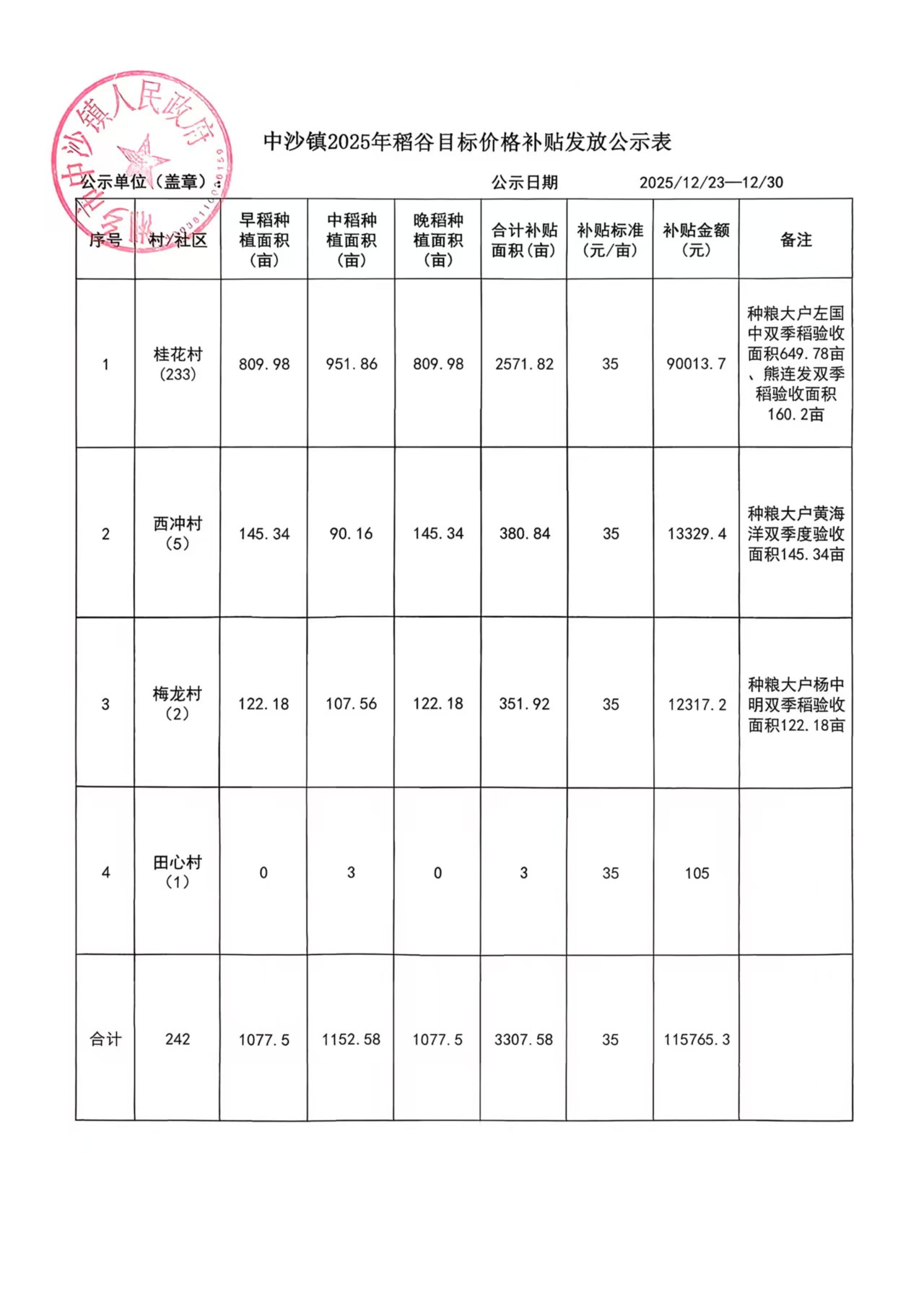 中沙鎮(zhèn)2025年稻谷目標(biāo)價(jià)格補(bǔ)貼發(fā)放公示表