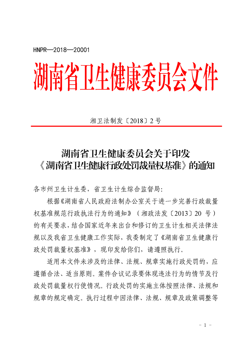 湖南省衛(wèi)生健康委員會(huì)關(guān)于印發(fā)《湖南省衛(wèi)生計(jì)生行政處罰裁量權(quán)基準(zhǔn)》的通知