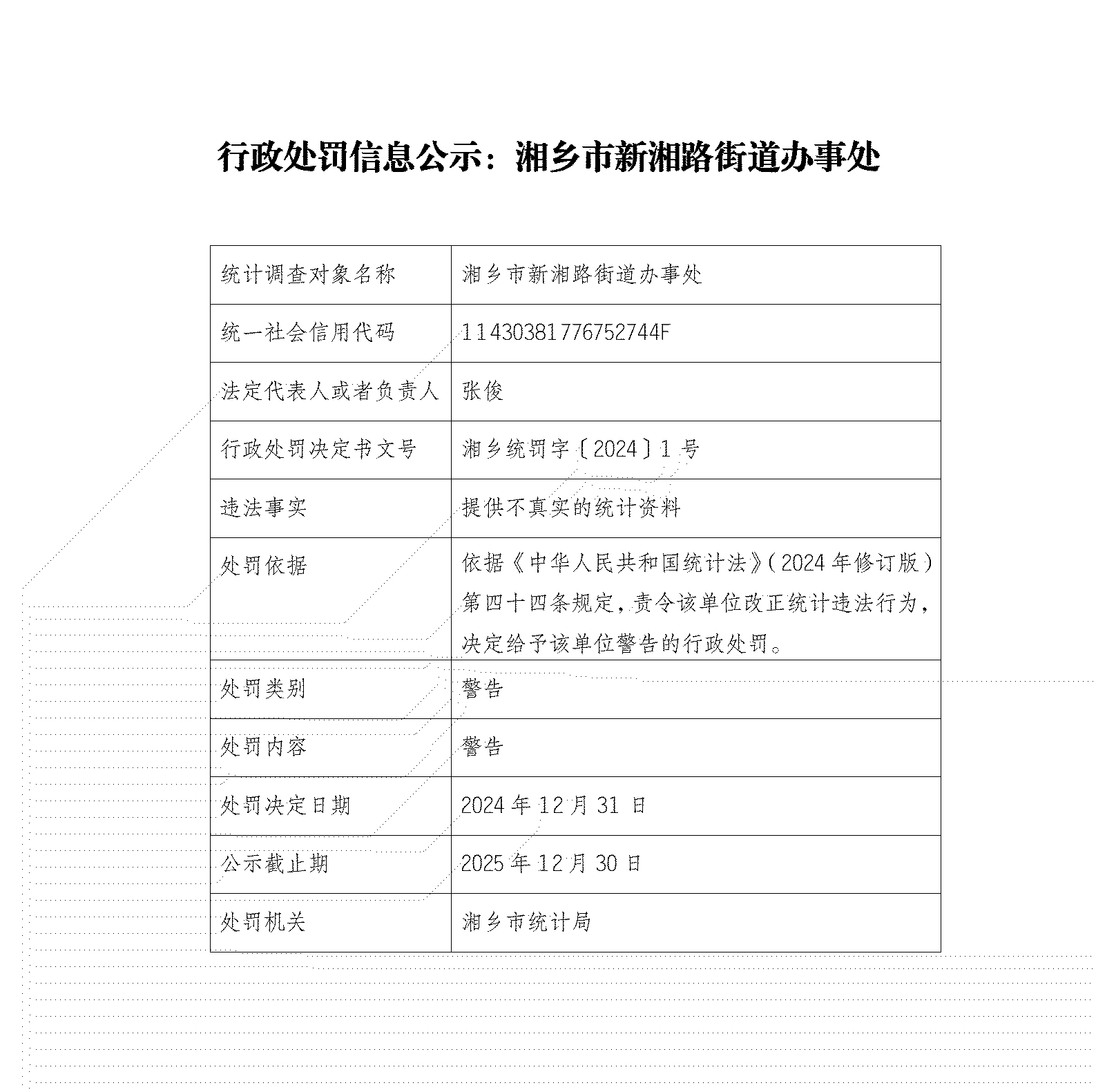 行政處罰信息公示:湘鄉市新湘路街道辦事處