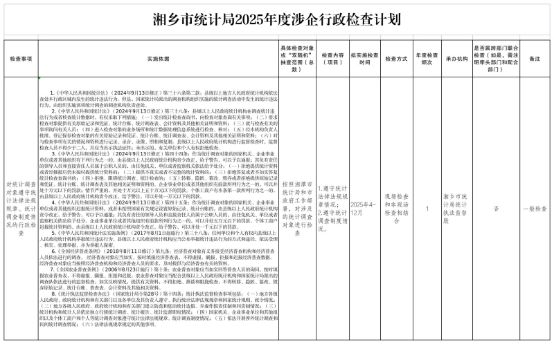 湘鄉市統計局2025年度涉企行政檢查計劃