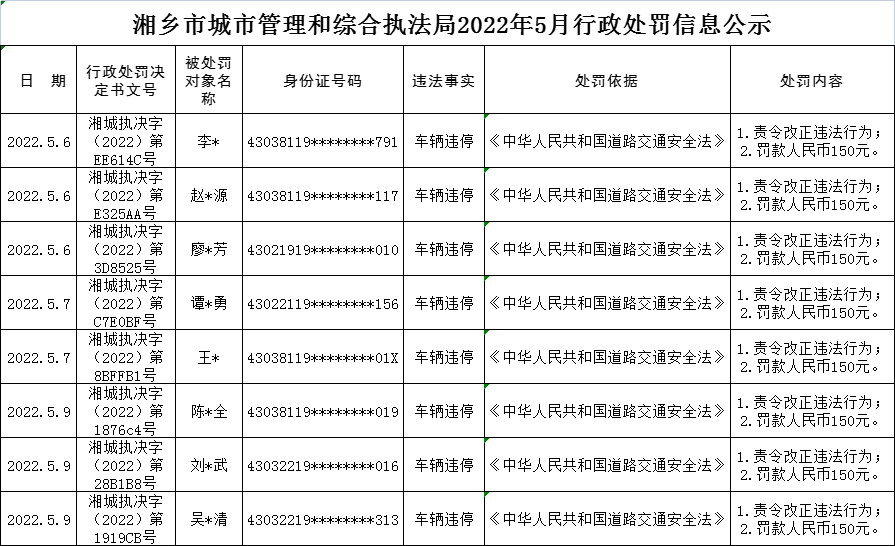 湘鄉市城市管理和綜合執法局2022年5月9日行政處罰公示