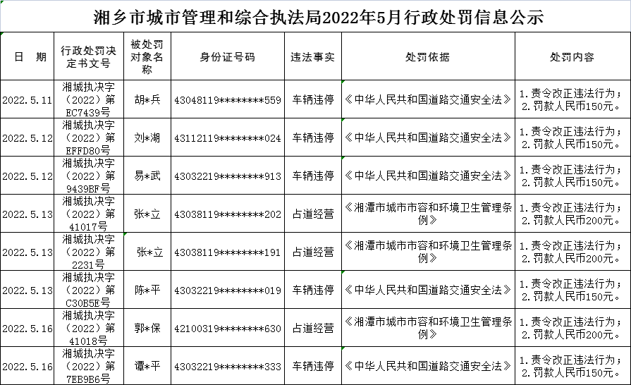 湘鄉市城市管理和綜合執法局2022年5月16日行政處罰公示
