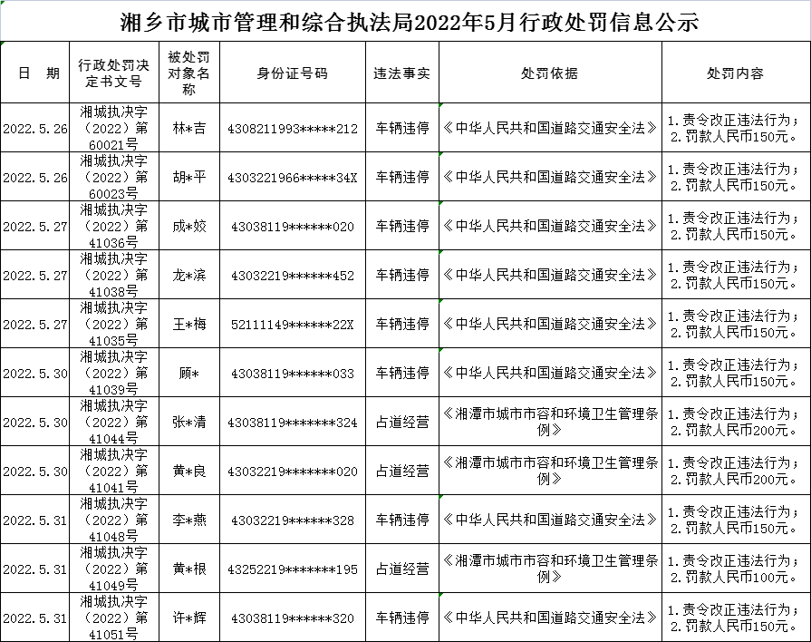 湘鄉市城市管理和綜合執法局2022年5月份行政處罰公示