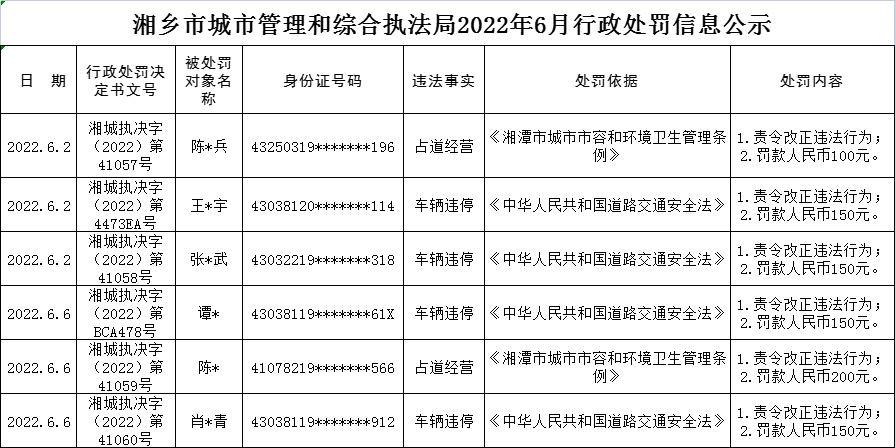 湘鄉市城市管理和綜合執法局2022年6月6日行政處罰公示