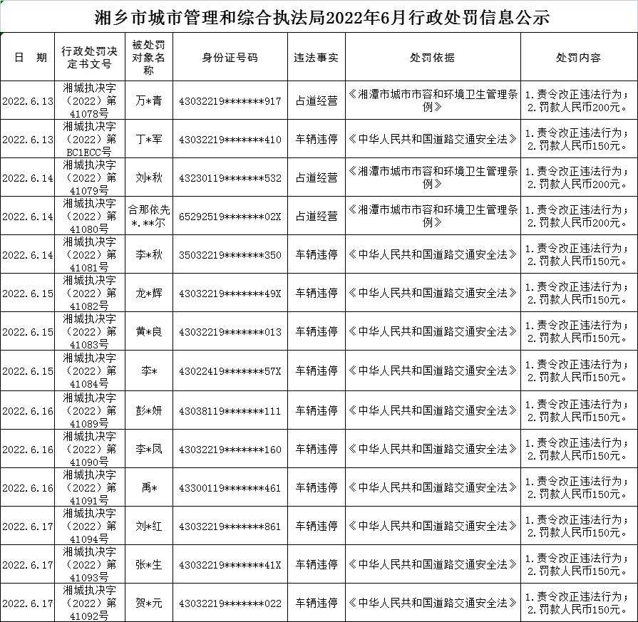 湘鄉市城市管理和綜合執法局2022年6月17日行政處罰公示