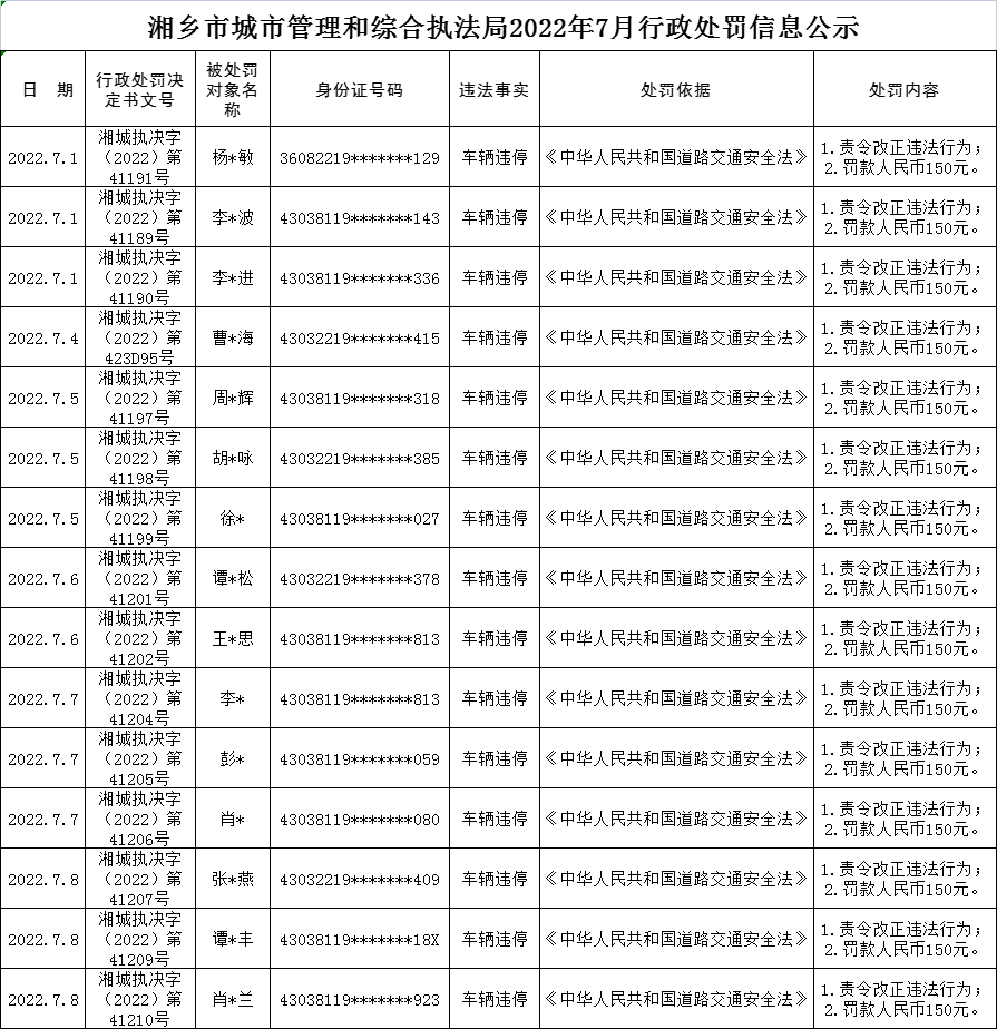 湘鄉市城市管理和綜合執法局2022年7月行政處罰公示