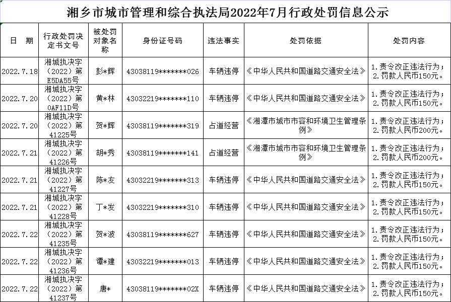 湘鄉(xiāng)市城市管理和綜合執(zhí)法局2022年7月22日行政處罰公示