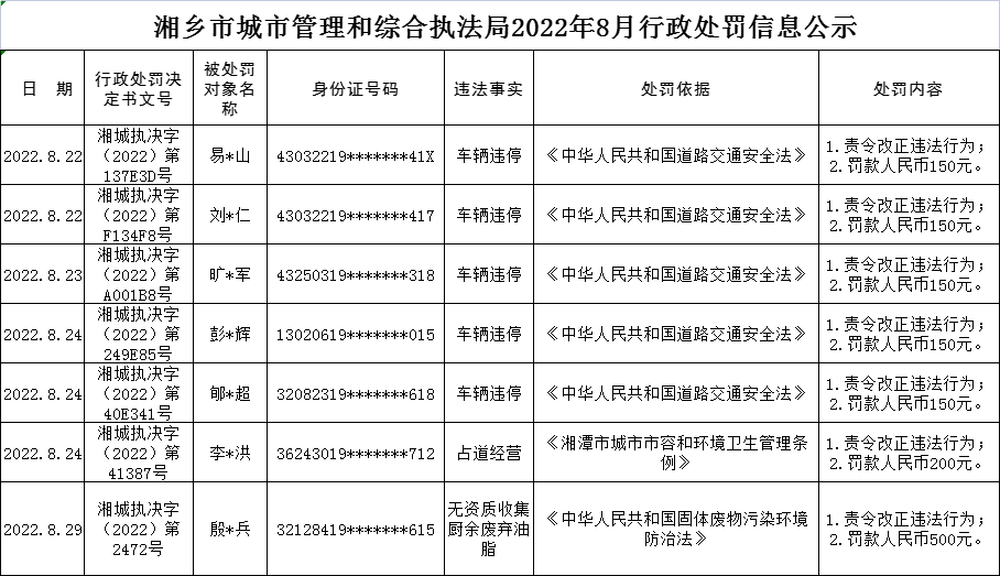 湘鄉市城市管理和綜合執法局2022年8月29行政處罰公示