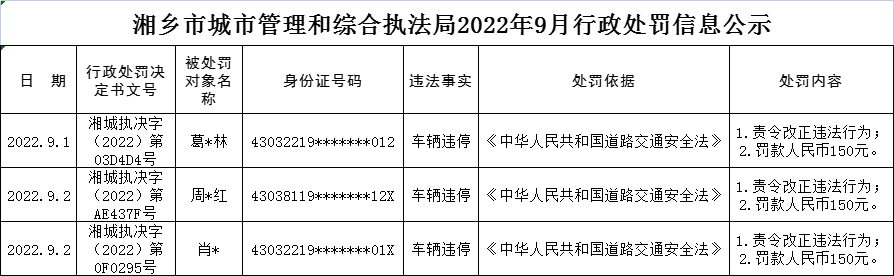 湘鄉(xiāng)市城市管理和綜合執(zhí)法局2022年9月2日行政處罰公示