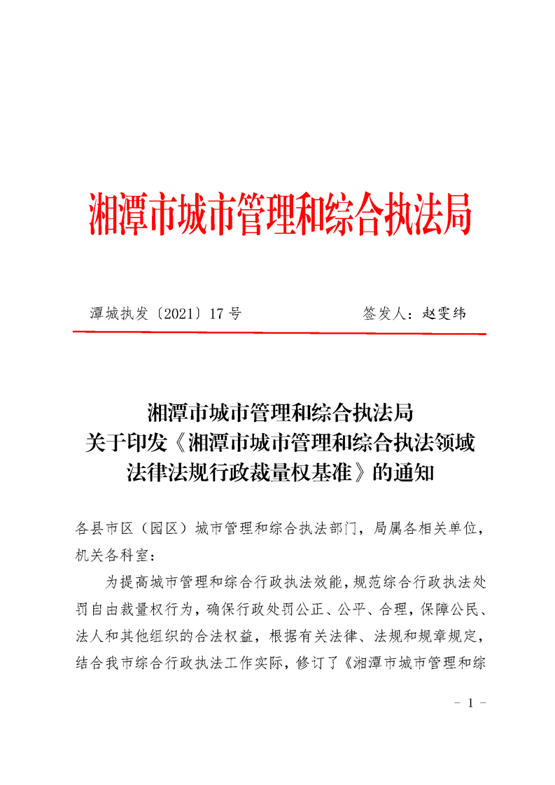湘潭市城市管理和綜合執法局關于印發《湘潭市城市管理和綜合執法領域法律法規行政裁量權基準》的通知