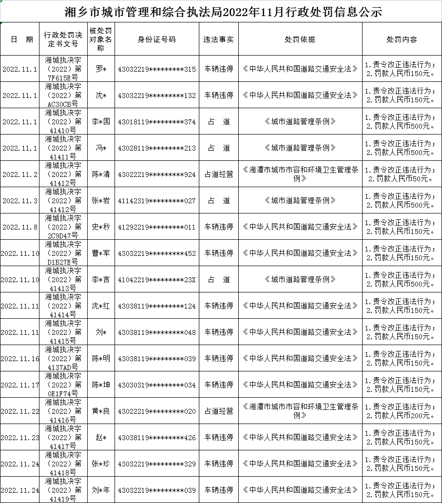 湘鄉市城市管理和綜合執法局2022年11月行政處罰公示
