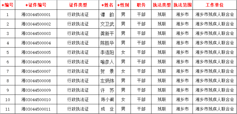 湘鄉(xiāng)市殘聯(lián)行政執(zhí)法人員信息公示