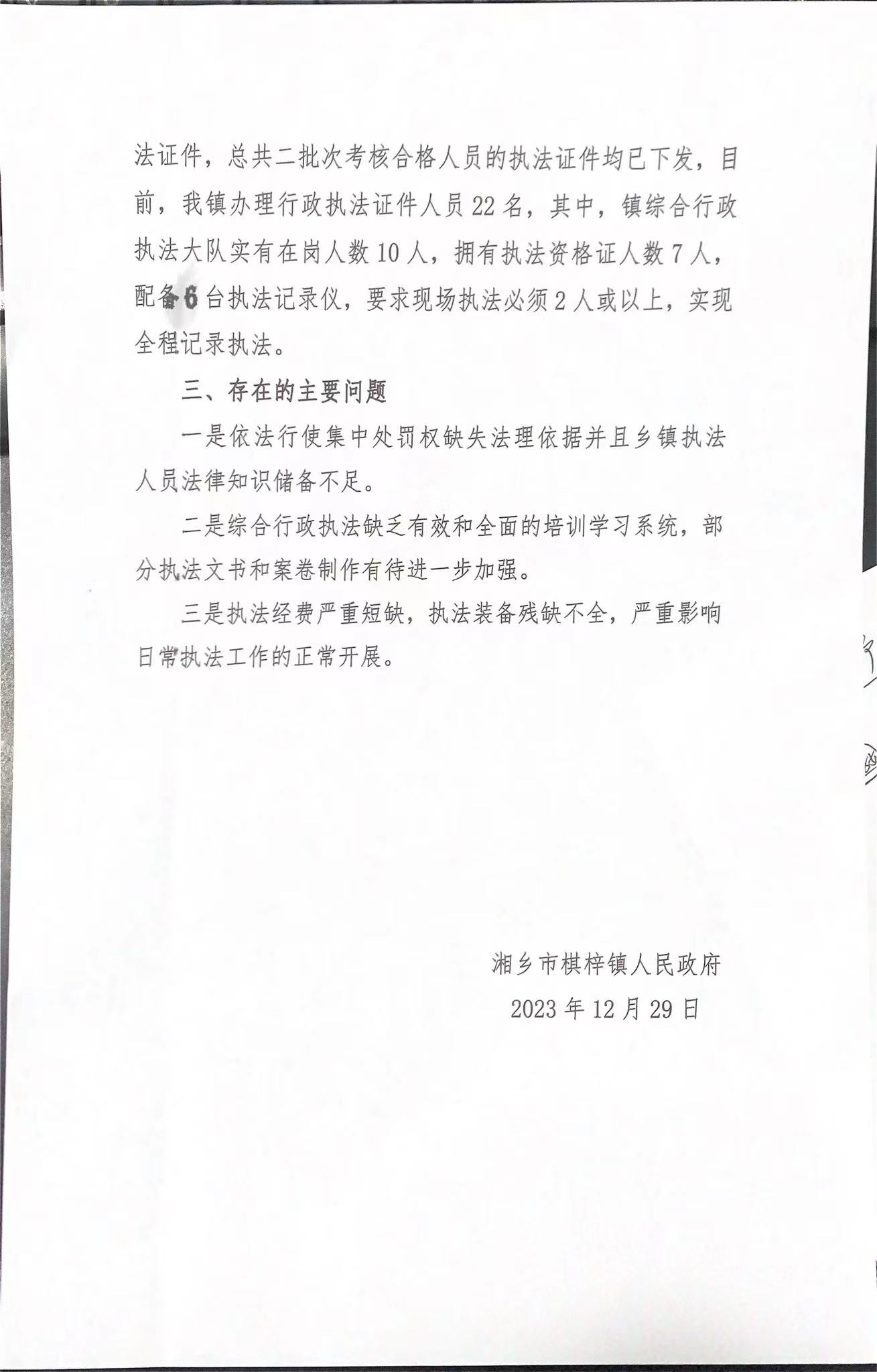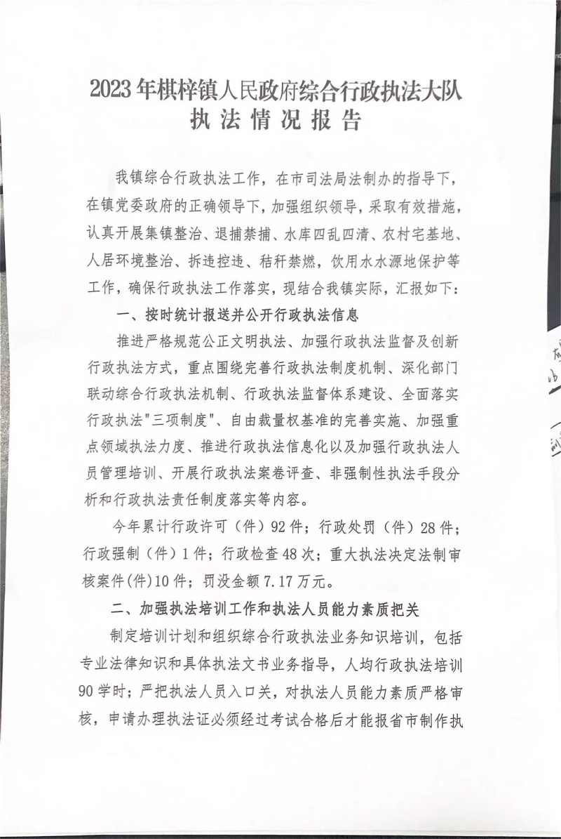 2023年棋梓鎮人民政府綜合行政執法大隊執法情況報告
