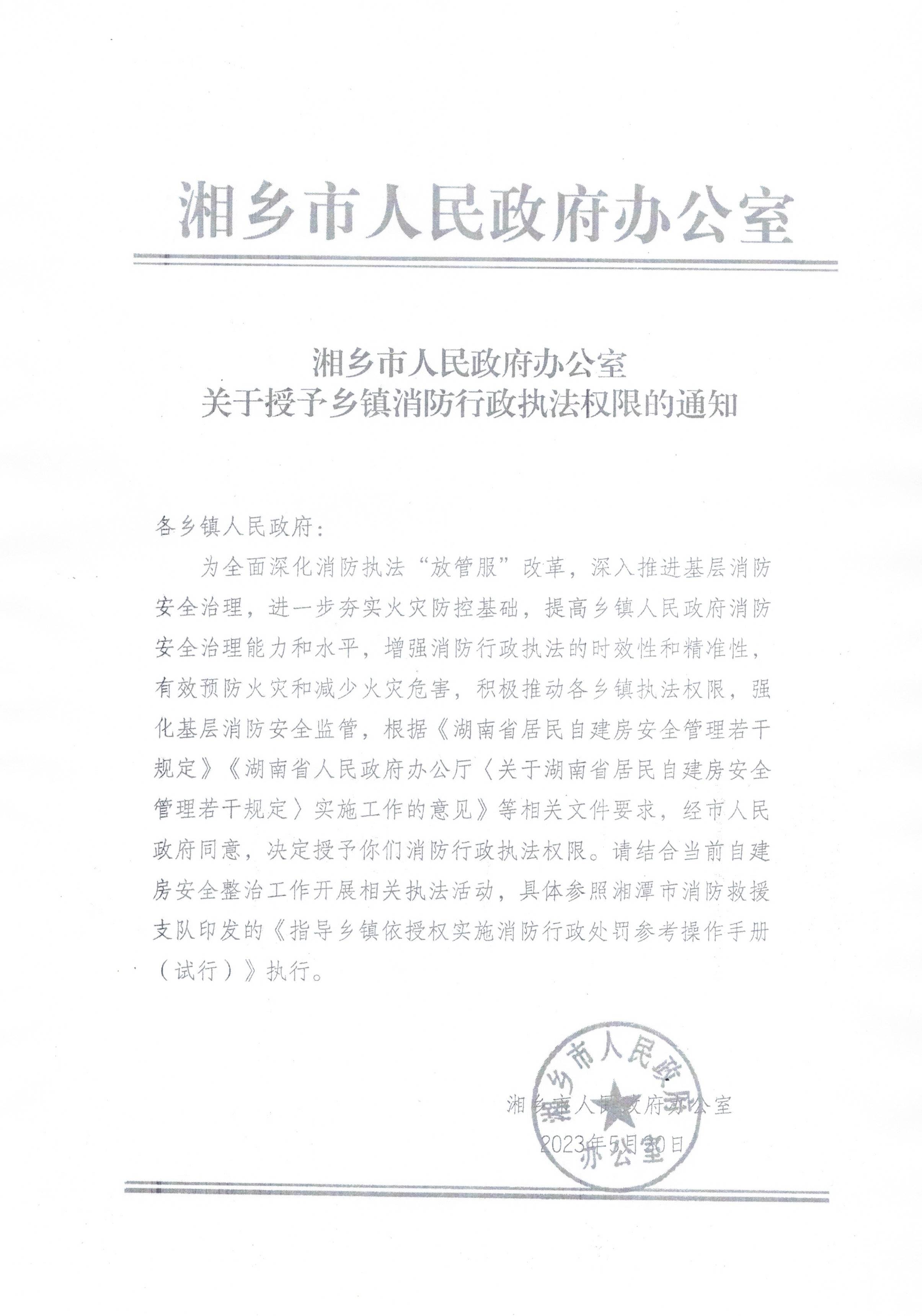 湘鄉市人民政府辦公室關于授予鄉鎮消防行政執法權限的通知