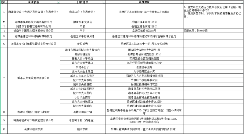 餐飲消費券分為滿600減240、滿300減120、滿150減60、滿30減12。領券后可在旺角清粥(中央綠城店、大正街店、東山燕興店、蓉瑾店)、吳記禾、望春門湘都食府、嗯呀湘鄉文創餐廳等店內使用。(湘潭市政府消費券餐飲承接企業名單附后)