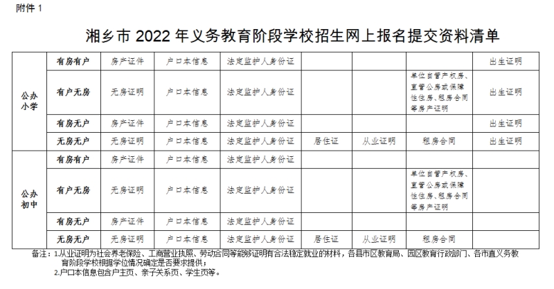 附件:1.湘鄉市2022年義務教育階段學校招生網上報名提交資料清單