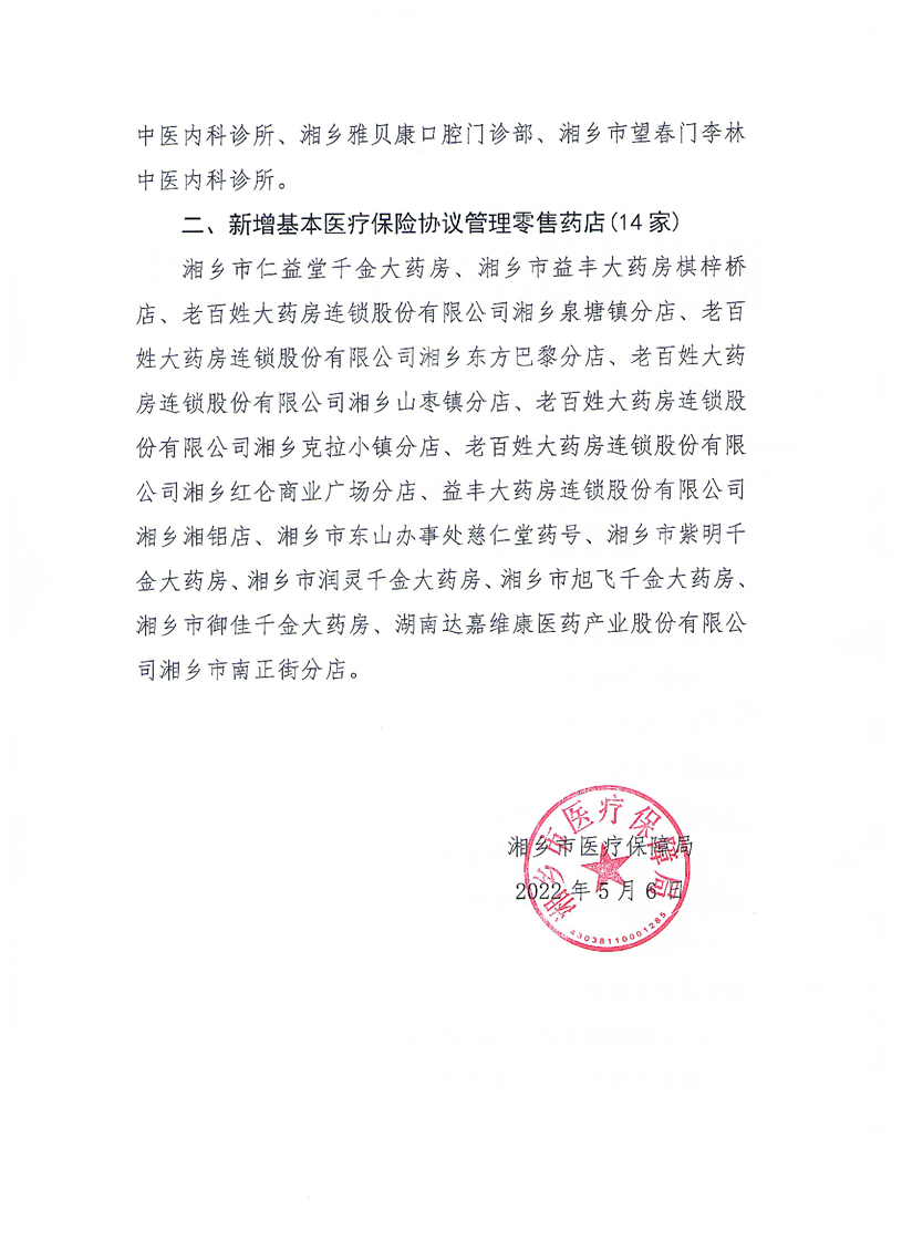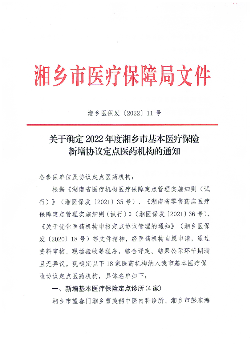 湘鄉(xiāng)市醫(yī)療保障局 關(guān)于確定2022年新增協(xié)議定點醫(yī)藥機構(gòu)的通知(湘鄉(xiāng)醫(yī)保發(fā)【2022】11號)