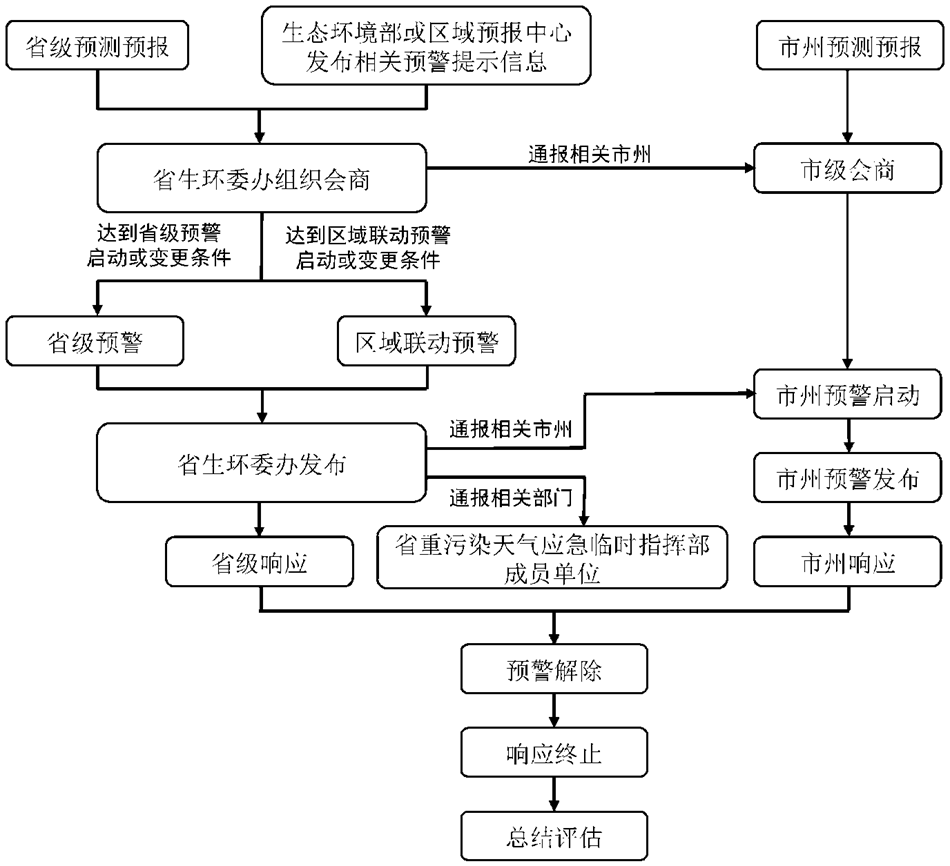 省生環委辦應根據預測預報情況和生態環境部、區域預報中心預警提示信息,通知相關市州按照本地重污染天氣應急預案,加強與周邊省份、城市應急聯動,及時啟動相應級別或更高級別的預警響應。