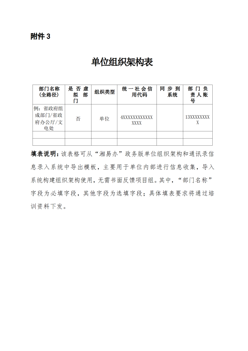 (三)開展信息采集工作。省“湘易辦”項目組已搭建“湘易辦”政務版單位組織架構和通訊錄信息錄入系統(http://59.230.0.41/orgDev/#/login)。培訓后,各單位管理員分別按照《單位組織架構表》(附件3)和《單位用戶信息表》(附件4)格式要求,整理單位組織架構和收集本單位用戶信息后,采取表格導入的方式,完成信息錄入工作。各單位要將下屬單位一并統計錄入。同時按要求填報《單位組織架構及通訊錄統計確認表》(附件5,附件6,附件7)。