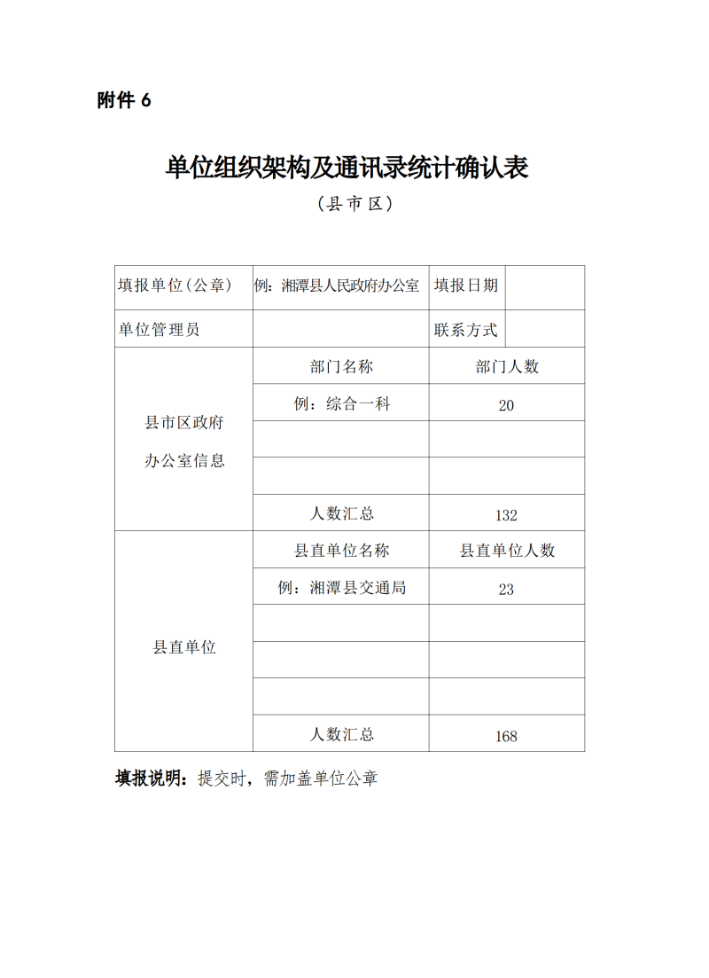 (四)提交確認表格。各級各部門在2022年12月12日前將《單位組織架構表》、《單位用戶信息表》、《單位組織架構及通訊錄統計確認表》電子表格和加蓋公章的掃描件報送市行政審批局電子政務管理科郵箱(437830535@qq.com)。