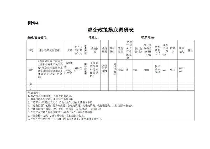 (六)創新應用場景,打造湖南特色。要結合湖南實際,全力打造相關特色服務和智慧服務。重點打造好政策兌現、數字營商地圖等惠企服務,變“人找政策”為“政策找人”,為企業精準提供我省產業布局、招商項目、企業信息、人才匯集、配套資源、惠企政策等信息,實現企業全生命周期服務“一鍵直達”。各地各部門要配合項目實施,全面梳理國家、省、市現行有效的惠企法律法規和政策文件,摸清政策現狀,優化兌現流程,形成本地本部門負責執行的惠企政策清單,完成《惠企政策摸底調研表》填報工作(附件4),配合“湘易辦”項目組做好現場調研、數據提供、系統開發、配套改造以及測試和后續優化工作,盡早實現政策“即申即享”和“免申即享”。同時,要主動提供產業、園區、招商項目、企業等相關數據,做好數據對接工作,共同建好具有湖南特色的“湘易辦”營商地圖。